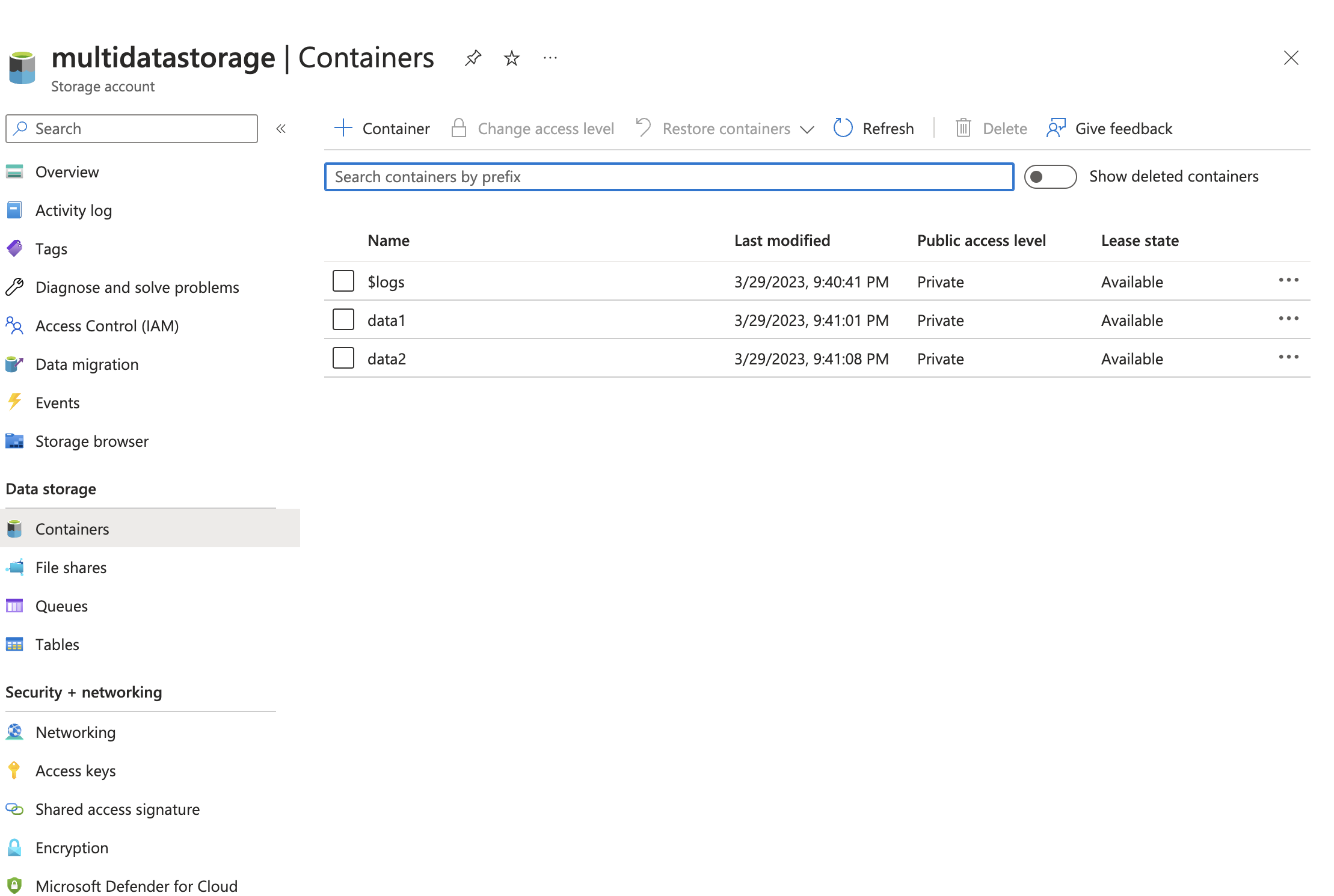In our scenario, we have 2 containers inside the ADLS multidatastorage: