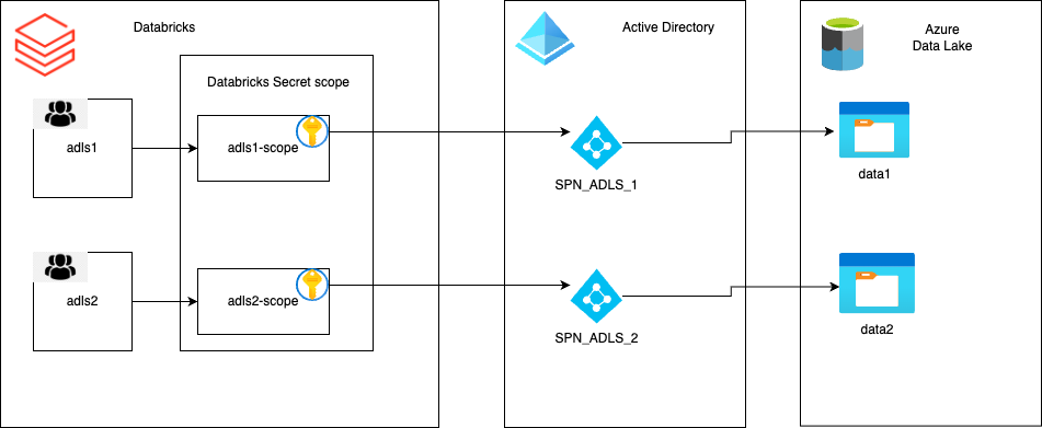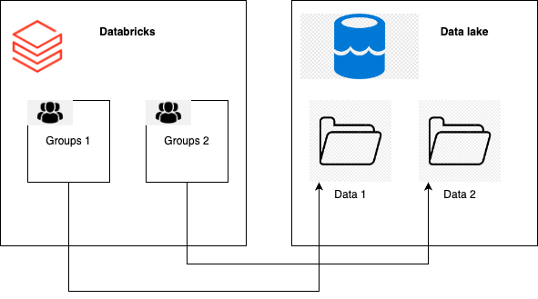In particular, in this example, we have 2 groups defined in databricks and two containers (or folders) inside the ADLS. Our goal is to grant GROUP1 only access to container Data1 and access to GROUP2 to only container DATA2.