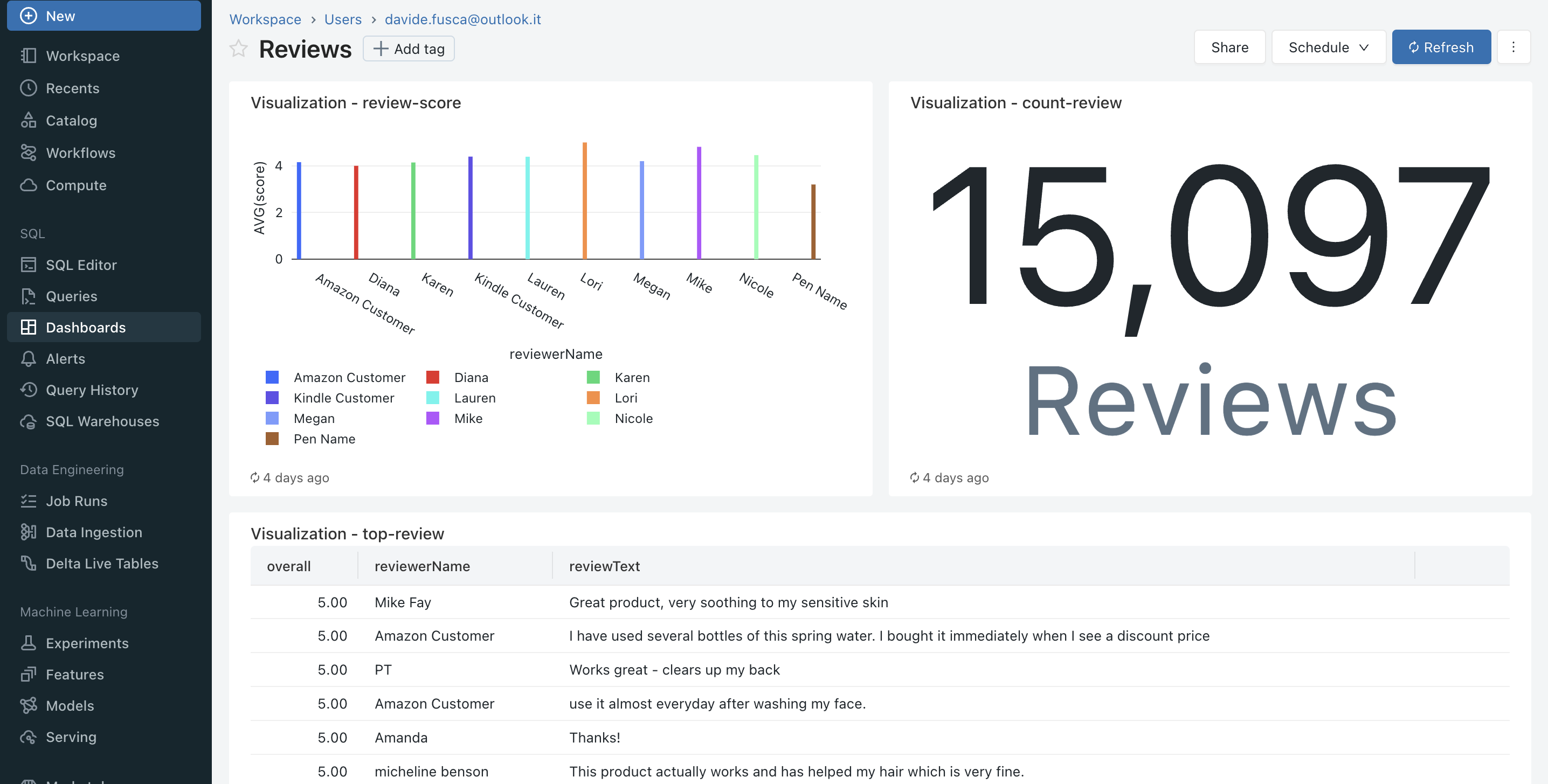 reviewer_score table computes reviewer scores by reading the preprocessed data and select the “overall” (rating) and “reviewerName” columns. It filters out rows where either the rating or reviewer’s name is null, groups the data by reviewerName, and aggregates statistics, including the count of reviews and the average score for each reviewer. The results are ordered by the number of reviews in descending order.