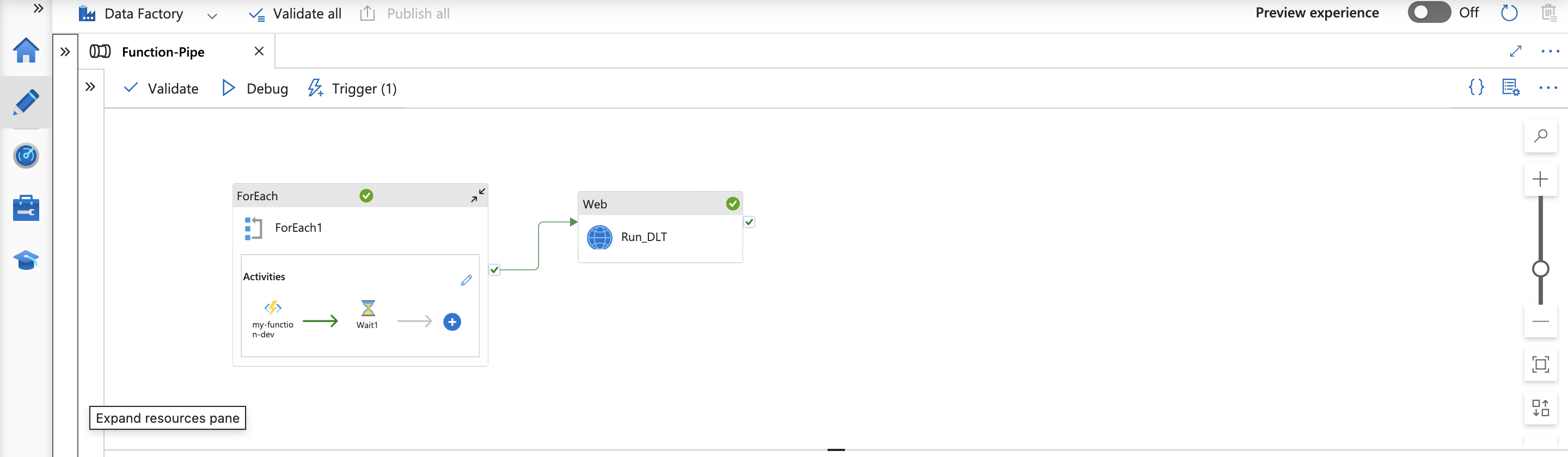 To automate the execution of both the function and the Delta Live Table (DLT), I’ve set up a straightforward pipeline using Azure Data Factory. This pipeline initiates the Azure function trigger, followed by the triggering of the DLT process in Databricks.