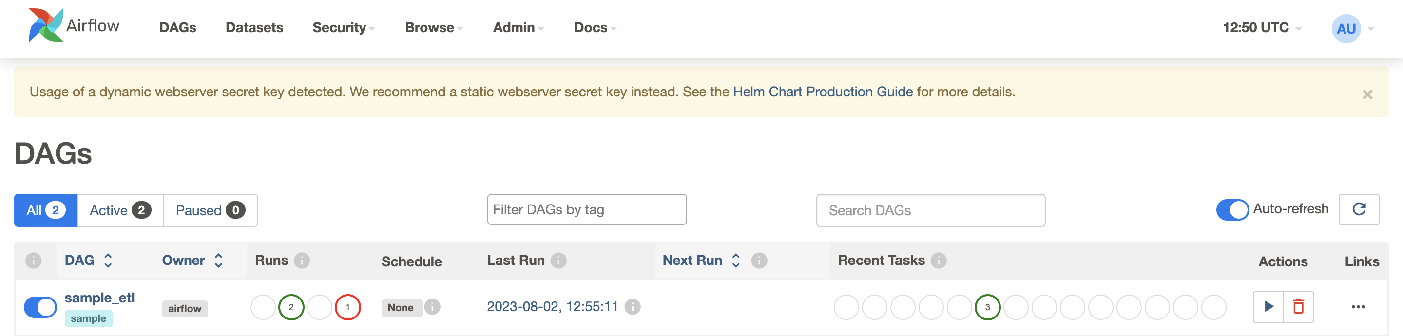 After running the port-forwarding command, open your browser and navigate to 127.0.0.1:8080. Here, you should be able to access the Airflow web interface. Upon successful connection, you will find the sample_etl DAG, which you defined earlier, listed in the Airflow interface. With your DAG ready, you can manually trigger its execution by clicking the play button. This action initiates the DAG run the workflow.