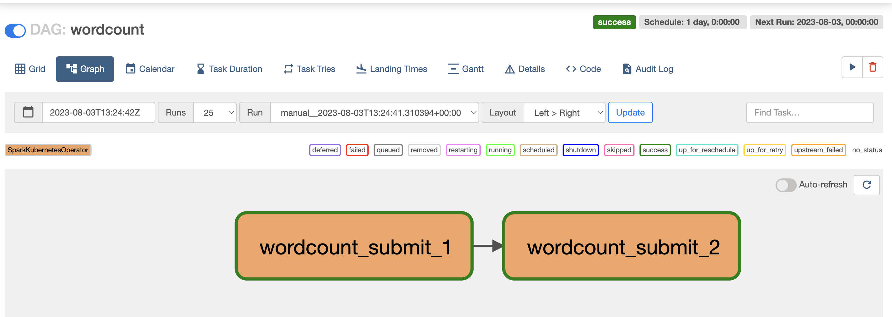 This DAG, named “wordcount,” will run daily, triggering two Spark jobs in sequence. The SparkKubernetesOperator is used to submit the SparkApplications, each using the respective YAML files defined earlier. The tasks are connected with submit_1 » submit_2 to ensure the second job runs after the first job has successfully completed.